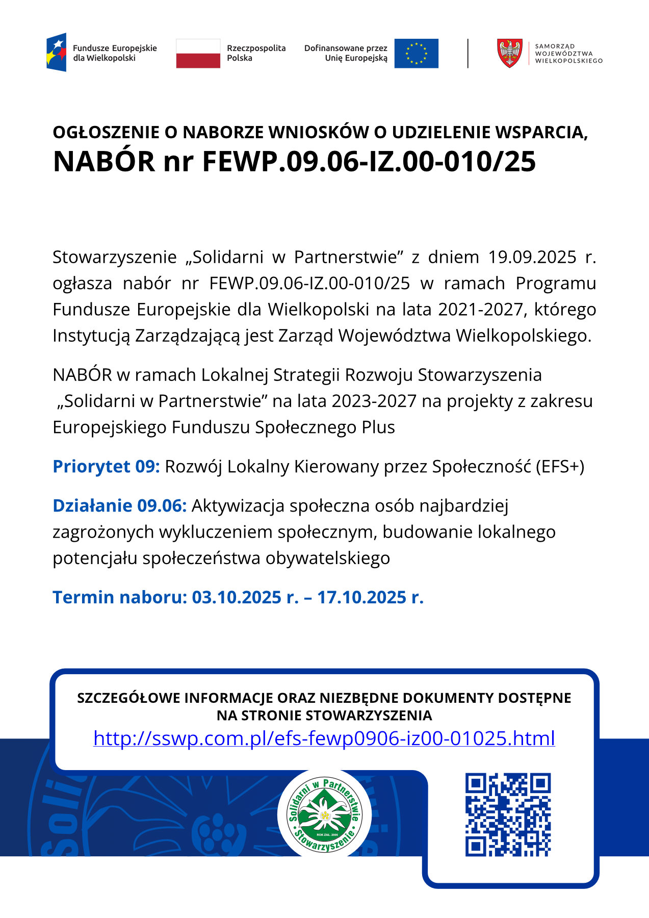 Stowarzyszenie „Solidarni w Partnerstwie” z dniem 19.09.2025 r. ogłasza nabór nr FEWP.09.06-IZ.00-010/25 w ramach Programu Fundusze Europejskie dla Wielkopolski na lata 2021-2027, którego Instytucją Zarządzającą jest Zarząd Województwa Wielkopolskiego.