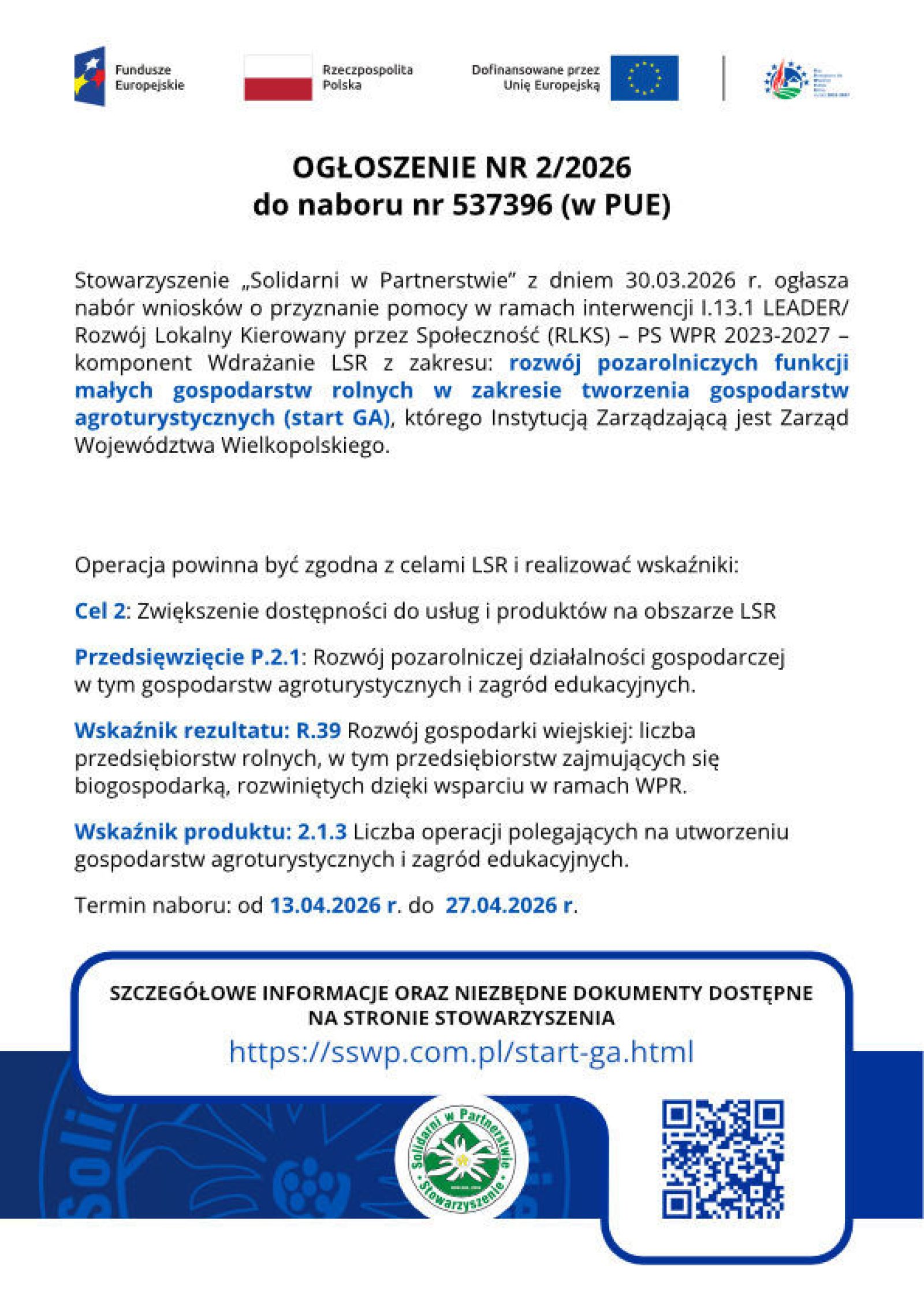 Stowarzyszenie „Solidarni w Partnerstwie” z dniem 30.03.2026 r. ogłasza nabór wniosków o przyznanie pomocy w ramach interwencji I.13.1 LEADER/ Rozwój Lokalny Kierowany przez Społeczność (RLKS) – PS WPR 2023-2027 – komponent Wdrażanie LSR z zakresu: rozwój pozarolniczych funkcji małych gospodarstw rolnych w zakresie tworzenia gospodarstw agroturystycznych (start GA), którego Instytucją Zarządzającą jest Zarząd Województwa Wielkopolskiego.