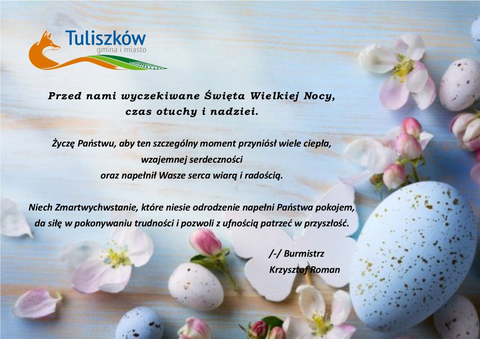 z okazji zbliżających się Świąt Bożego Narodzenia Burmistrz Krzysztof Roman, kierownicy jednostek organizacyjnych oraz pracownicy Urzędu Gminy i Miasta w Tuliszkowie składają najserdeczniejsze życzenia.